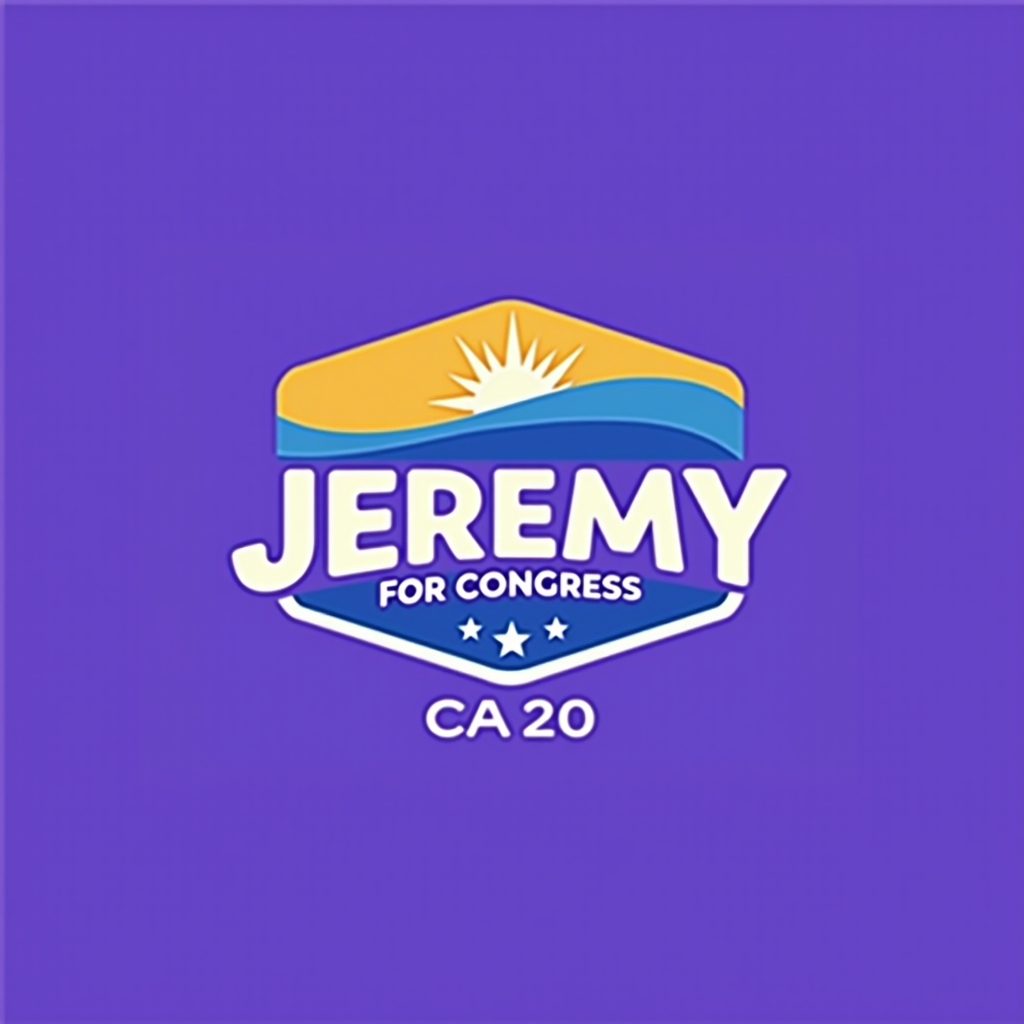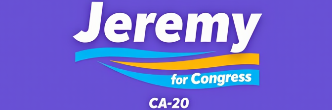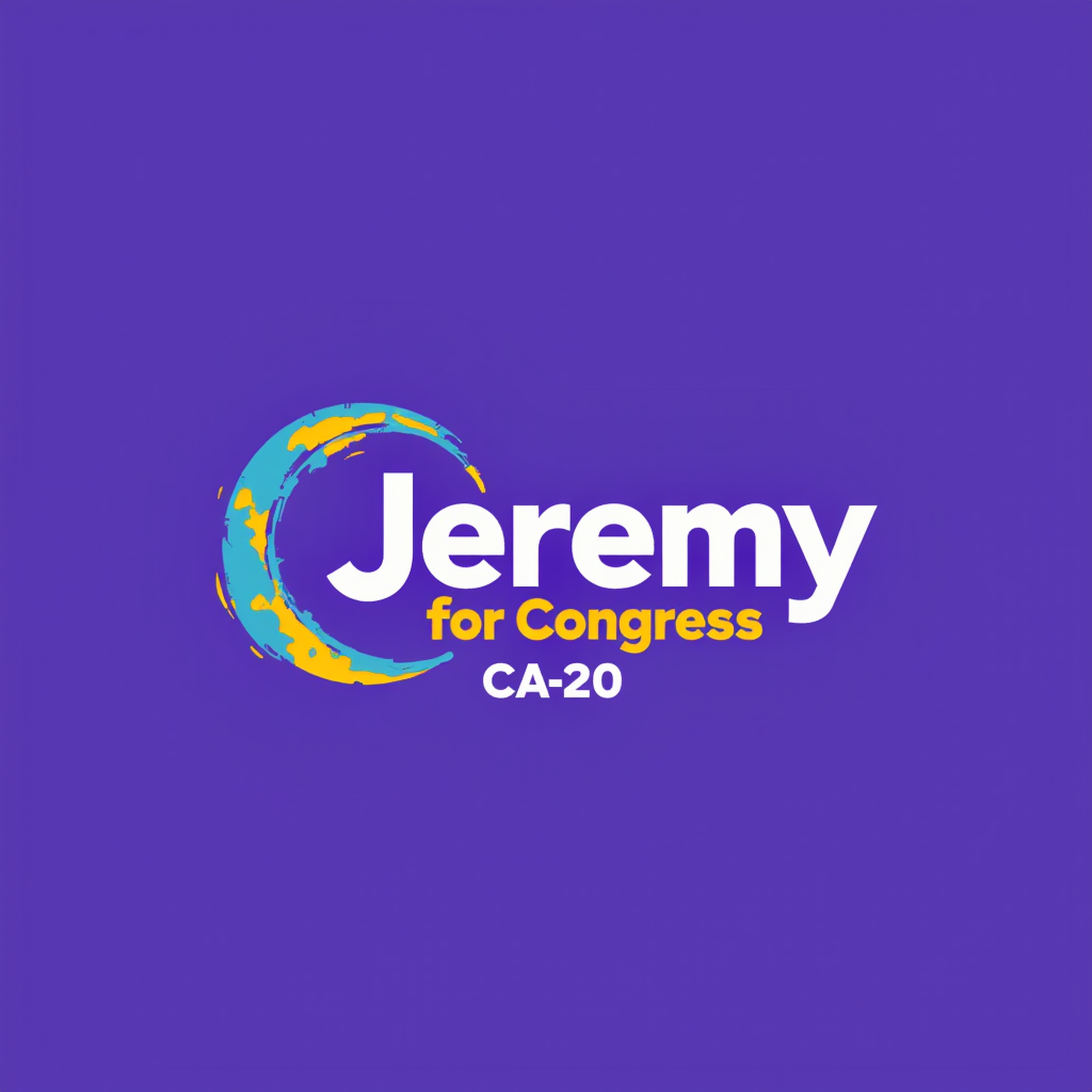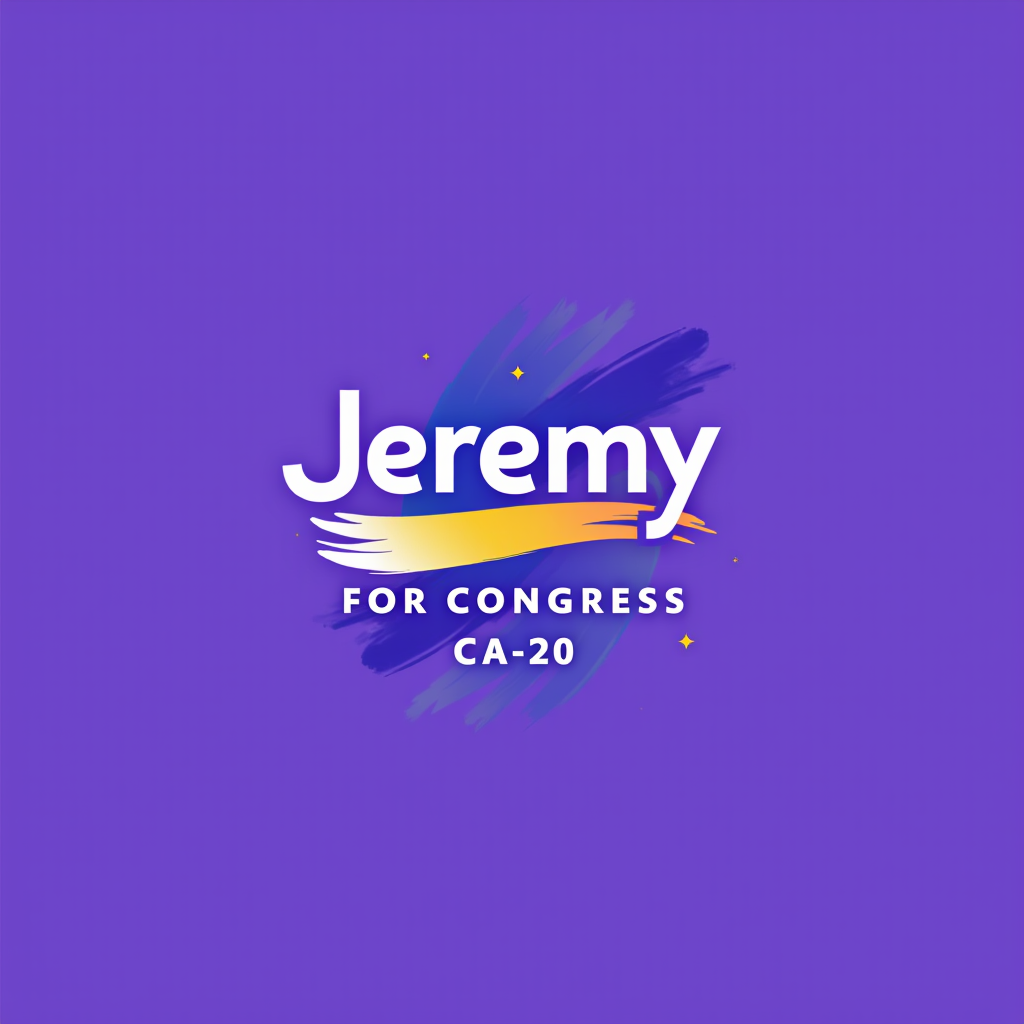 Campaign logo with the name Jeremy for Congress, CA-20, on a purple background with a yellow and purple brushstroke design.