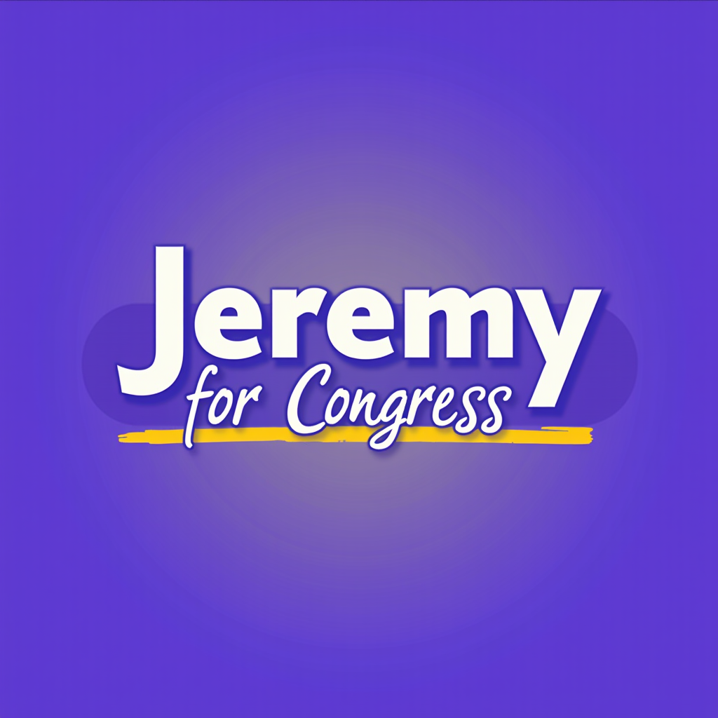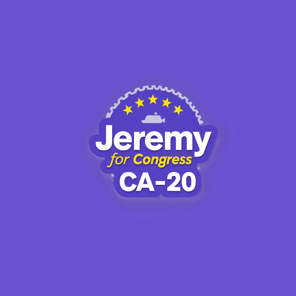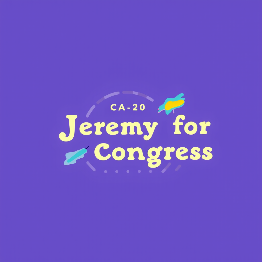 Campaign logo with the name Jeremy for Congress, CA-20, on a purple background with a yellow and purple brushstroke design.