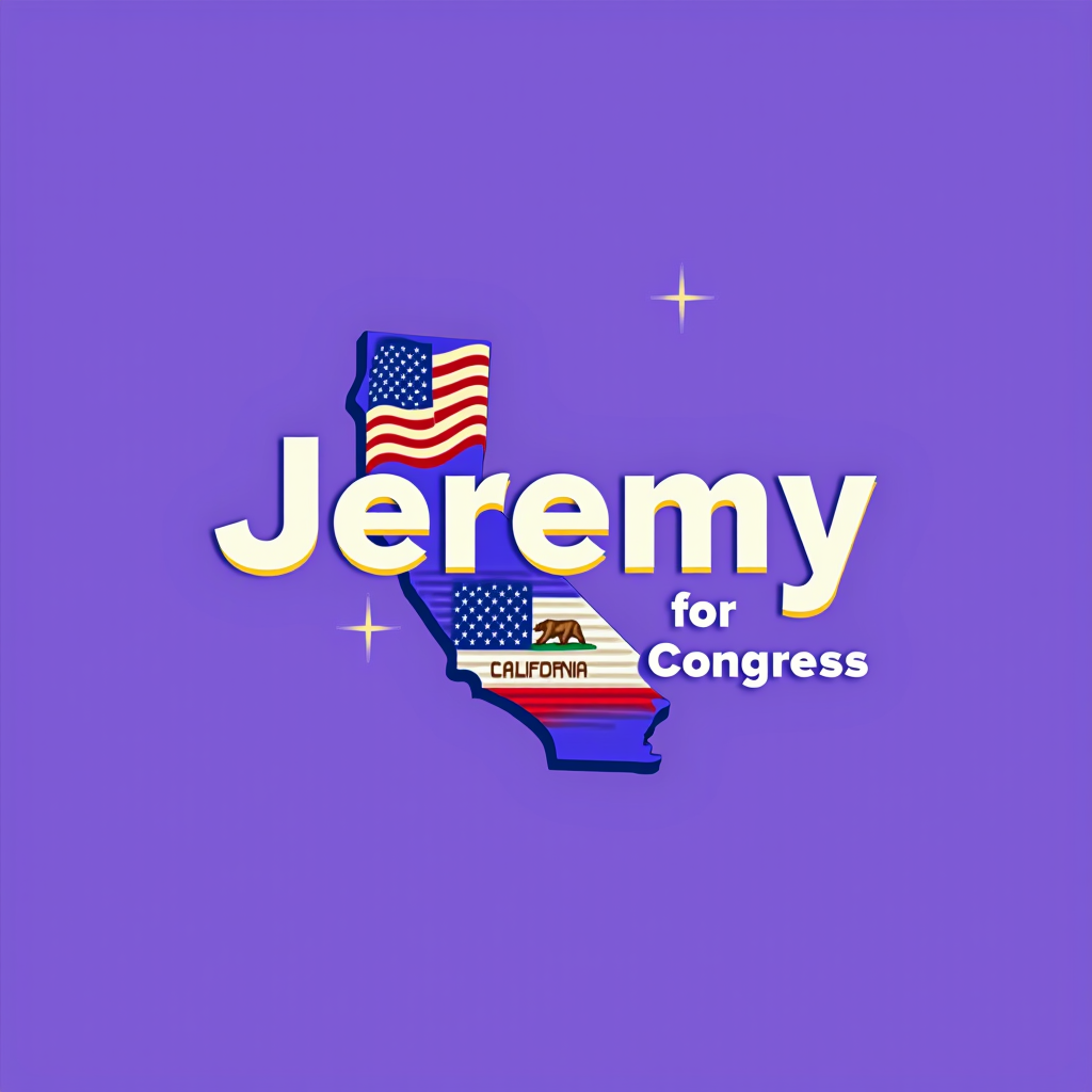 Campaign graphic with the shape of California filled with American flags and the state flag, featuring the text "Jeremy for Congress" on a purple background with star accents.