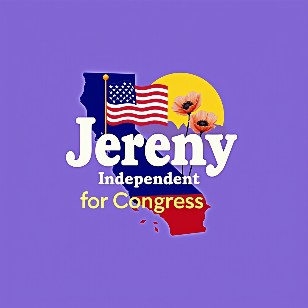 Graphic with the name 'Jereny' promoting independent political candidate for Congress, includes a map of California, the American flag, a yellow sun, and two orange flowers, set against a purple background.