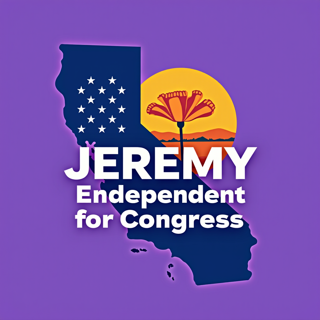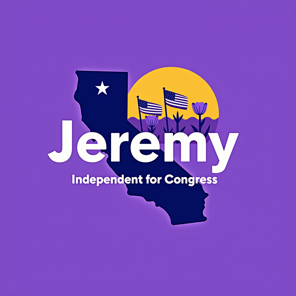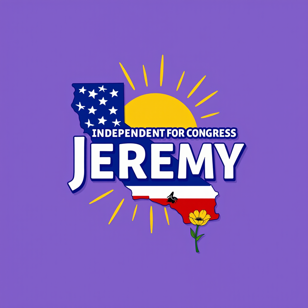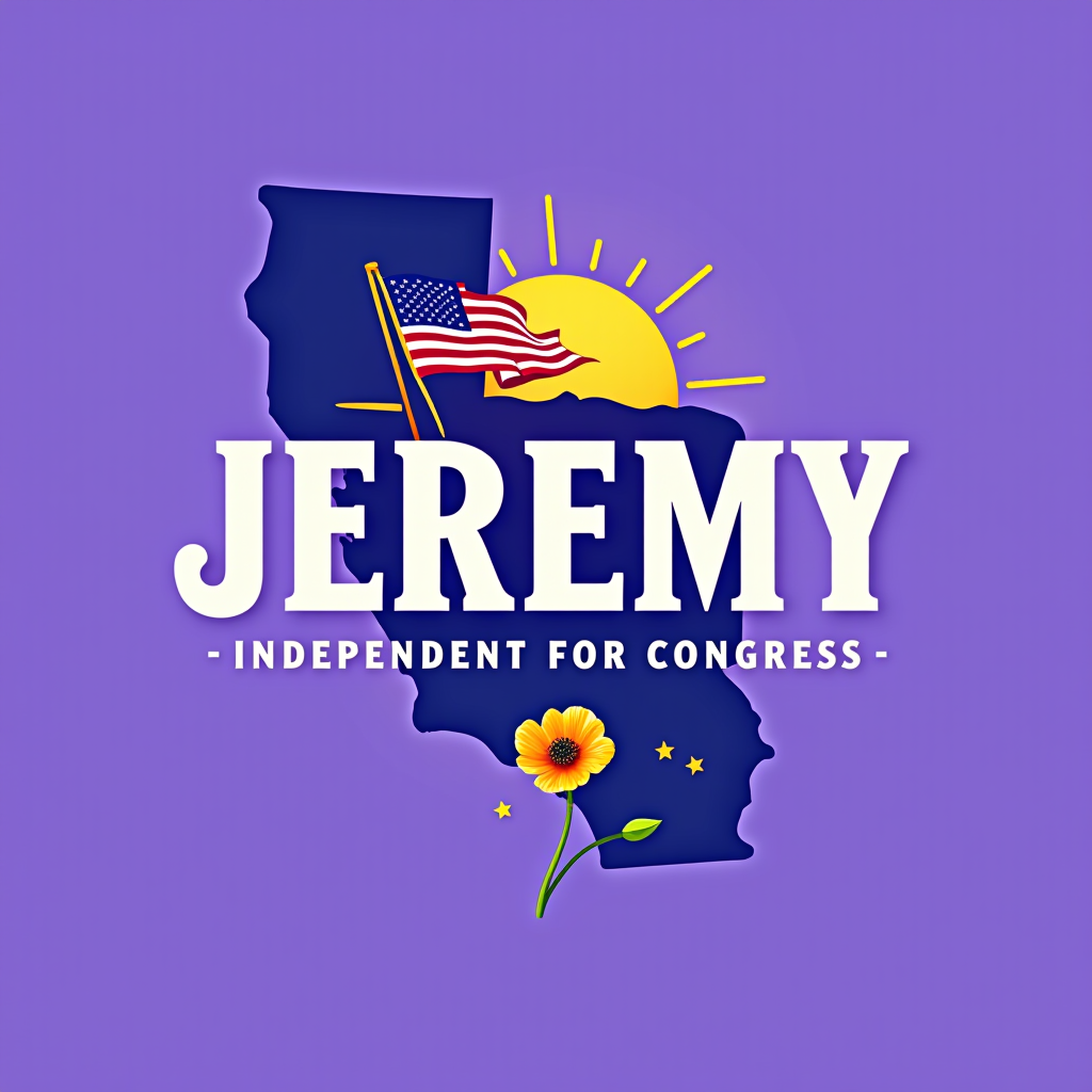 Campaign image for Jeremy, an independent candidate for Congress, featuring a silhouette of California with palm trees, American flags, a yellow sun, and a purple background.