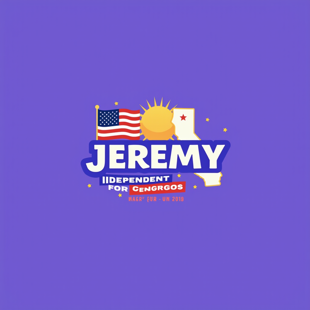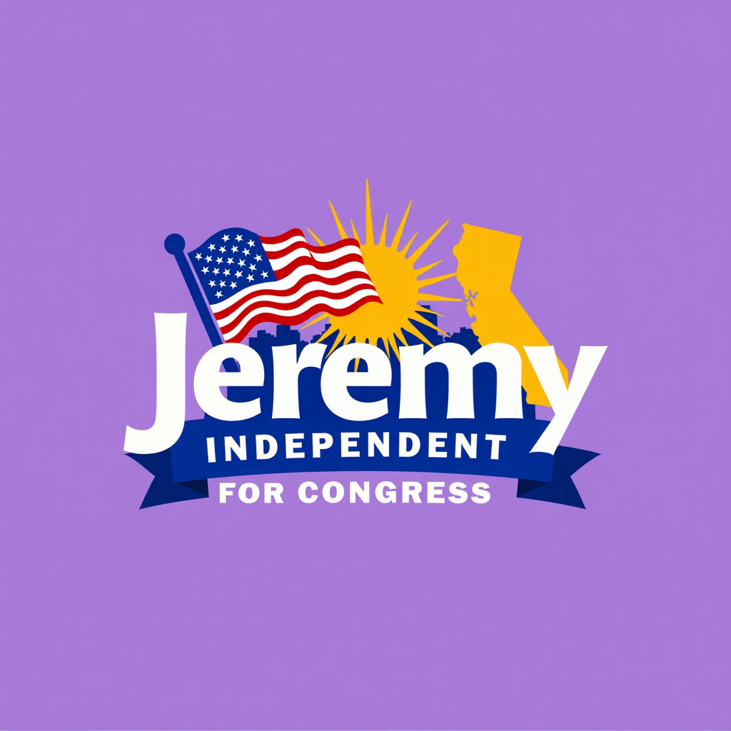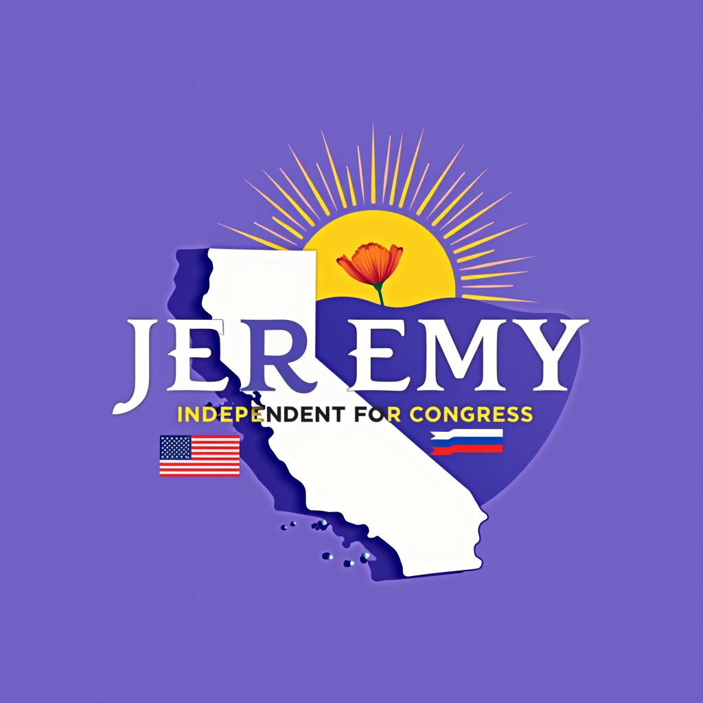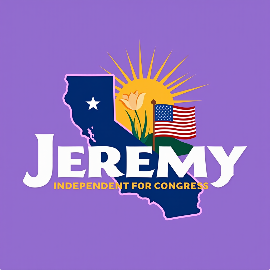 Campaign image for Jeremy, an independent candidate for Congress, featuring a silhouette of California with palm trees, American flags, a yellow sun, and a purple background.