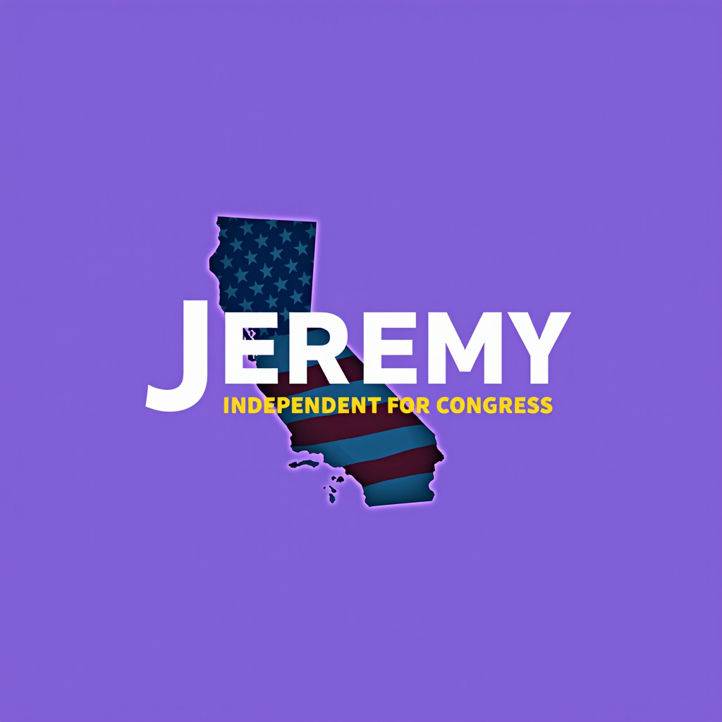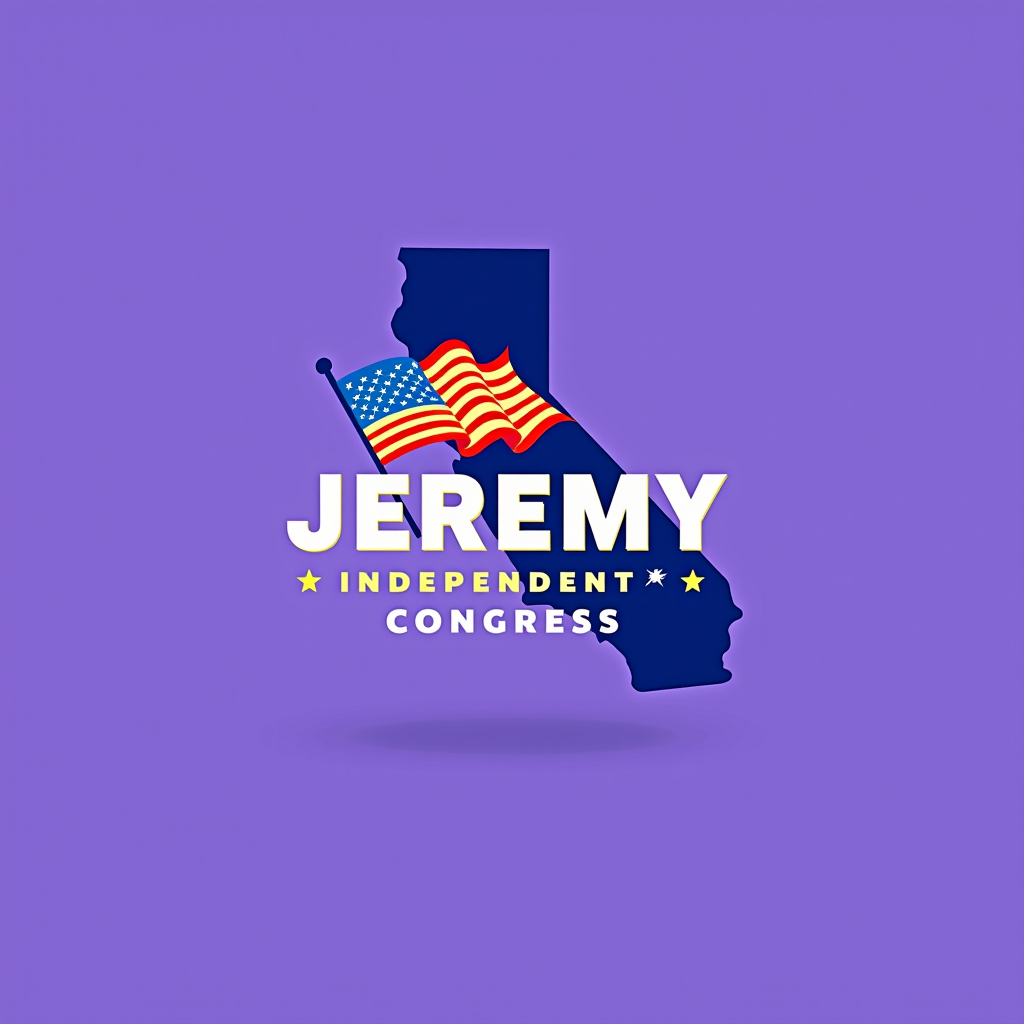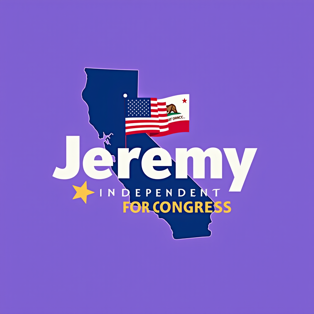 Graphic of the state of California with an American flag and campaign text for Jeremy, an independent candidate for Congress.