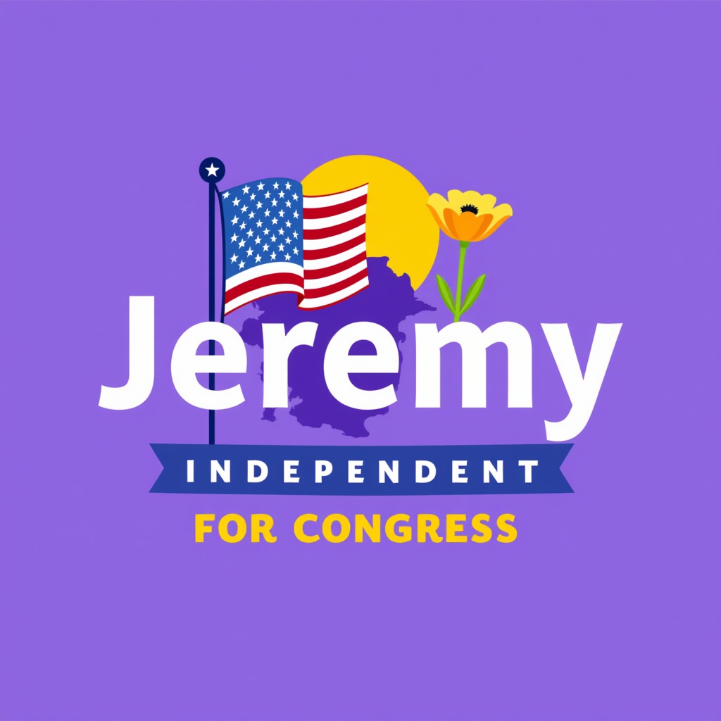 Political campaign graphic with the name Jeremy, promoting independence for Congress, featuring an American flag, a yellow sun, a purple background, and a flower.
