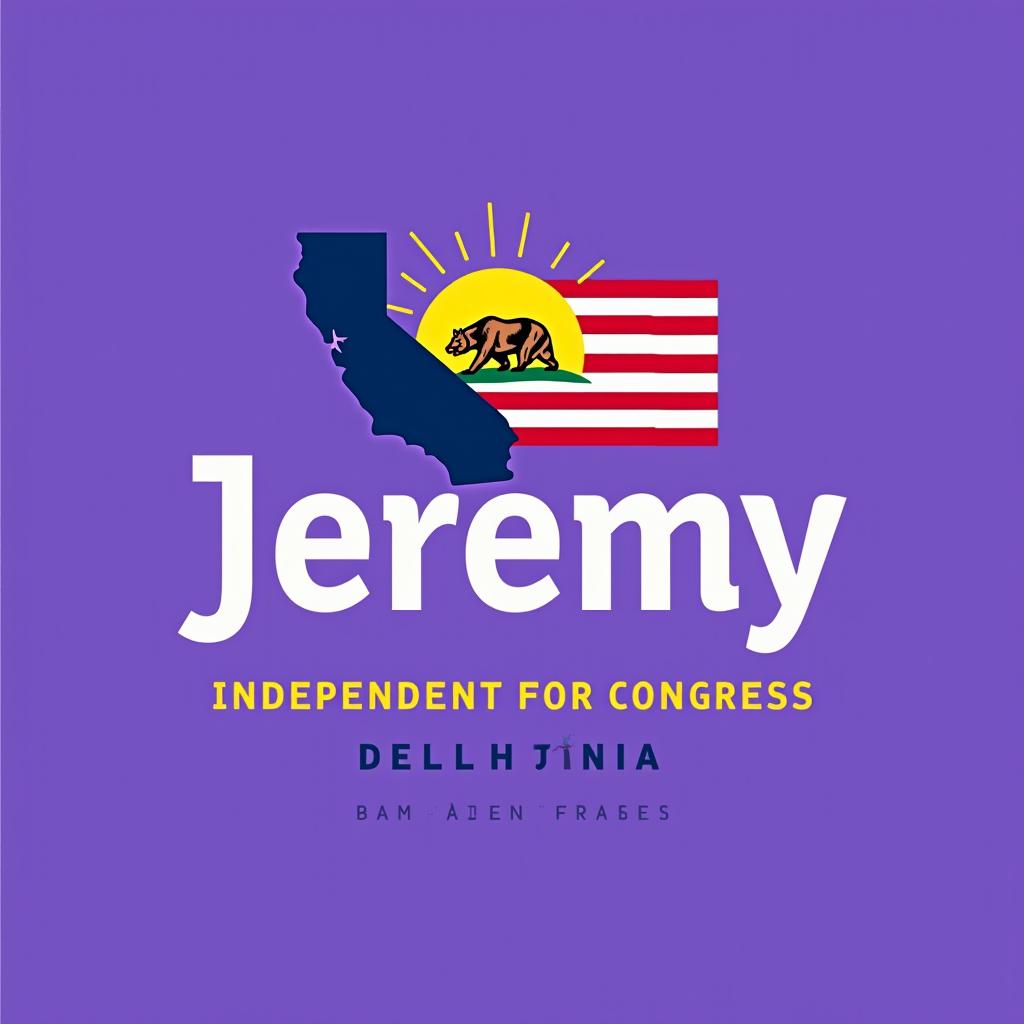 A campaign logo featuring the state of California, a sunset with a bear, and an American flag. The text reads "Jeremy" with the slogan "Independent for Congress" and the location in smaller letters.