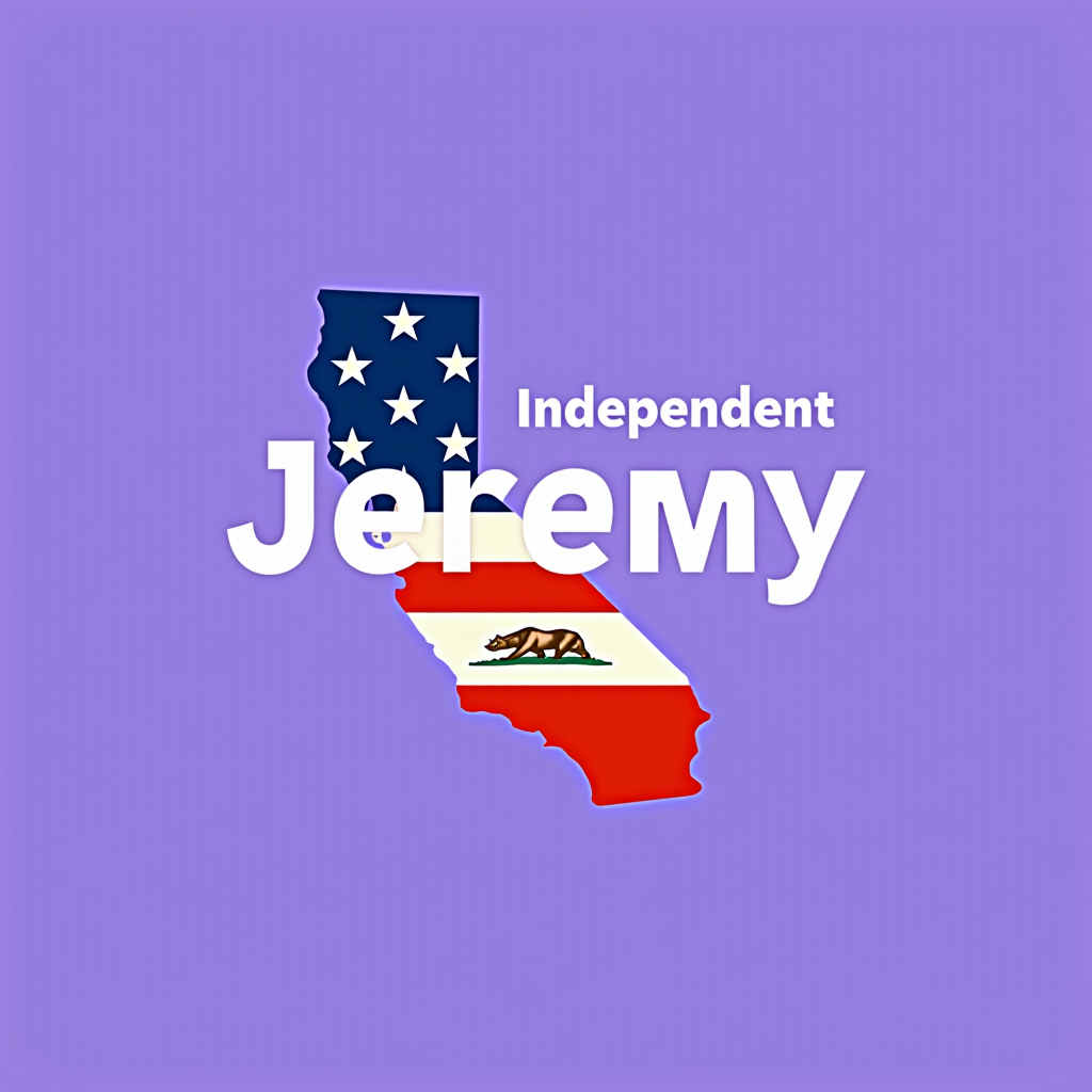 A graphic of the state of California with the American flag pattern, featuring white stars on a blue background at the top and red, white, and green stripes with a bear in the middle. The text reads "Independent Jeremy."