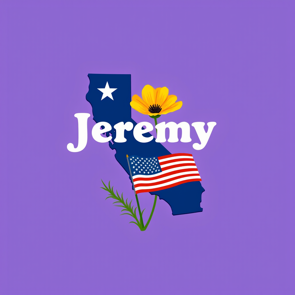 Illustration of the state of California in dark blue with a white star, a yellow flower, and an American flag partially covering the state. The word 'Jeremy' is written across the illustration in white, bubbly font. The background is lavender.