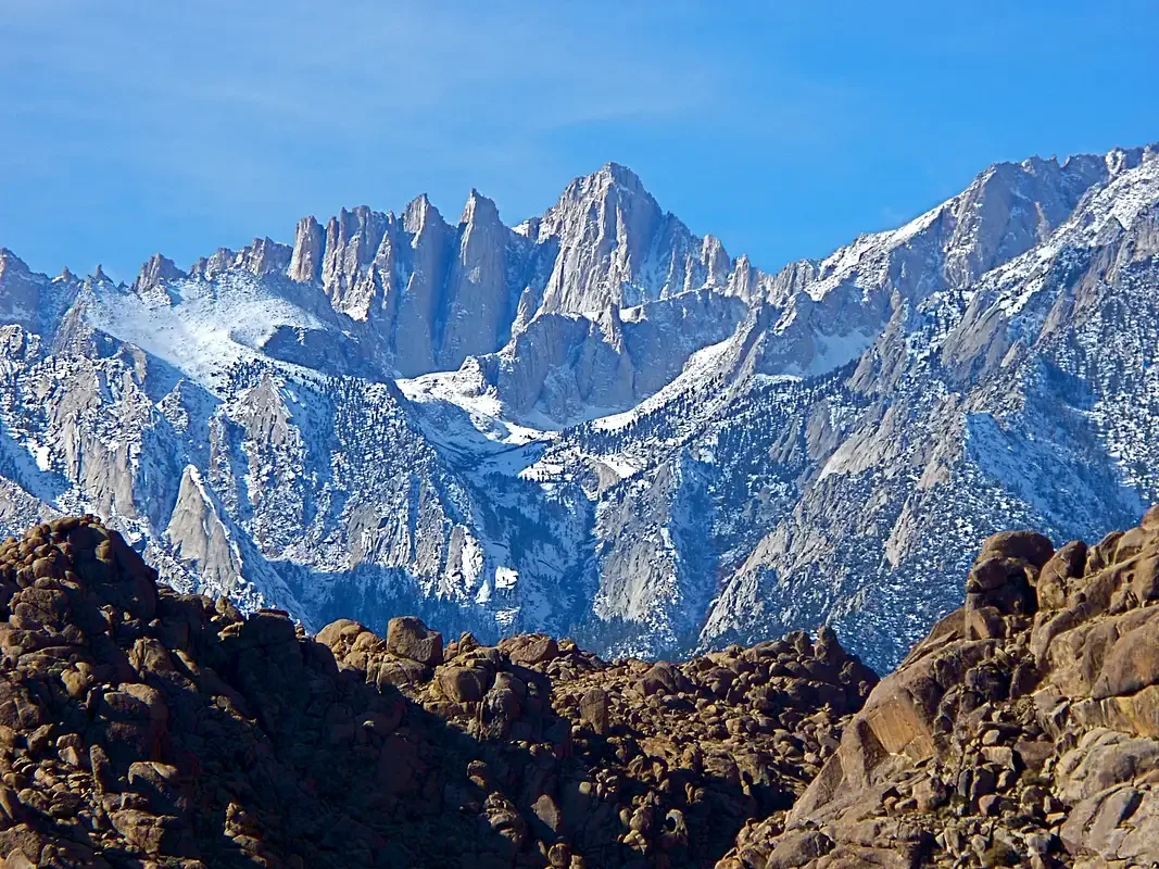 Snow-capped rugged mountain peaks under a clear blue sky with rocky foreground.