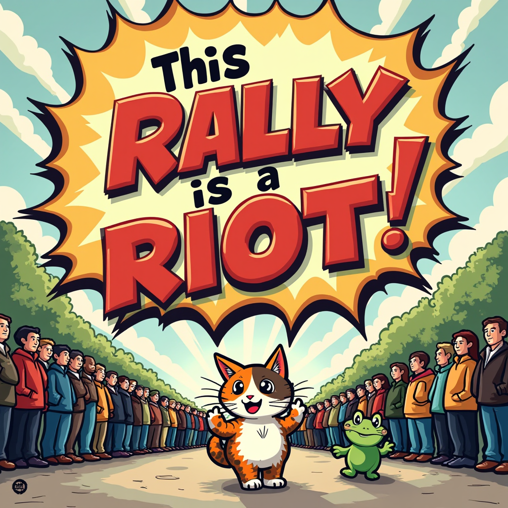 Crowd gathered at a protest or demonstration near a road with signs, flags, and inflatable characters including a large yellow chicken and a unicorn. Tents and chairs are set up among the people, some standing and others sitting.