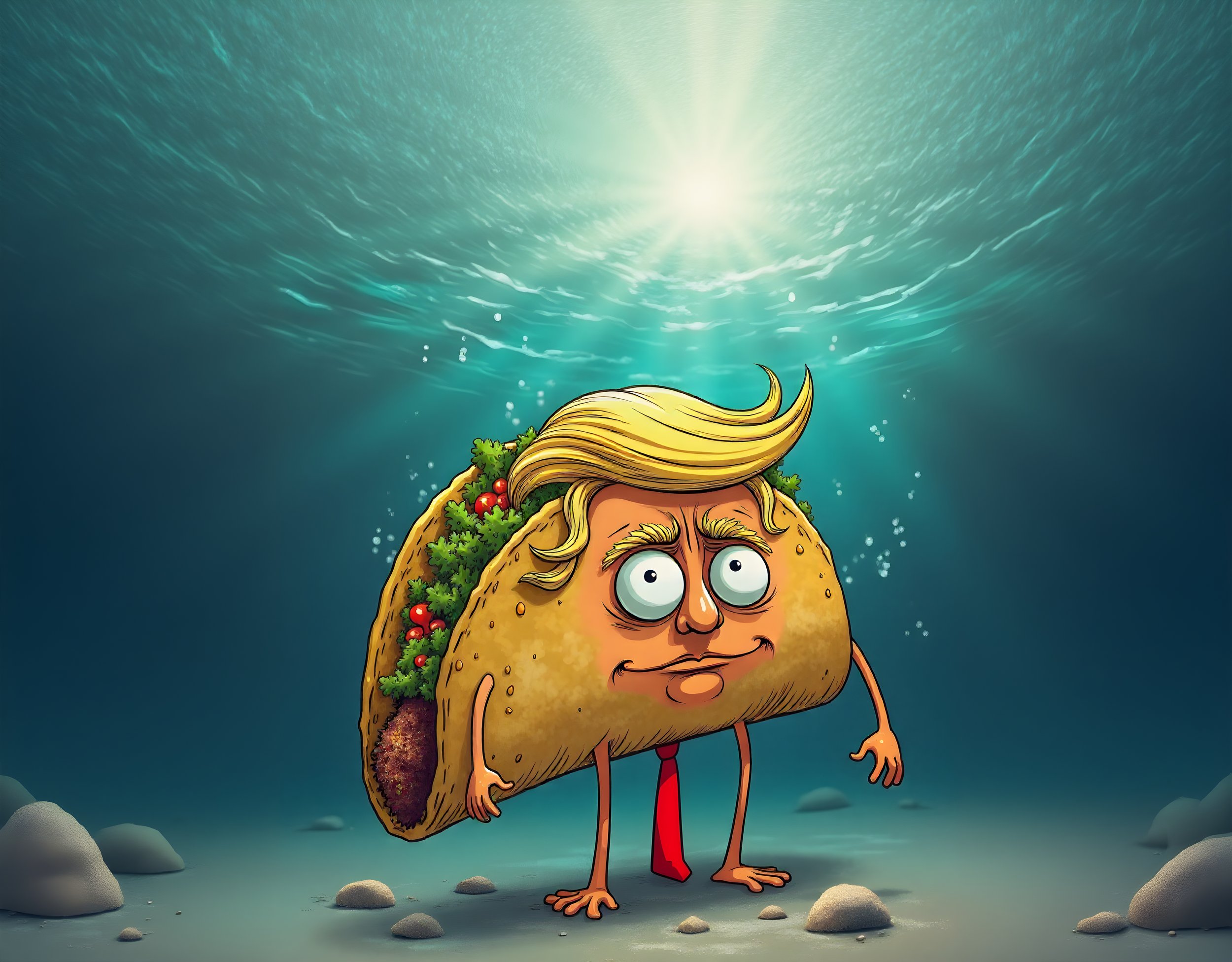 Protesters gather on a sidewalk holding signs, some with American flags, near traffic lights and a mountain of cars. An inflatable unicorn is near a tent on the right.