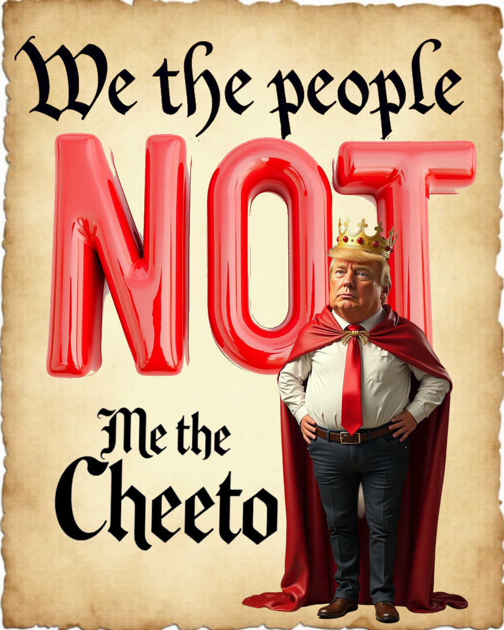 People standing and sitting on the sidewalk holding signs and flags at a protest or rally. One sign reads 'M=Morons A=Are G=Governing A=America.' Others display American flags and messages opposing a king or monarchy. The scene is under a large tree with traffic and cars visible in the background.